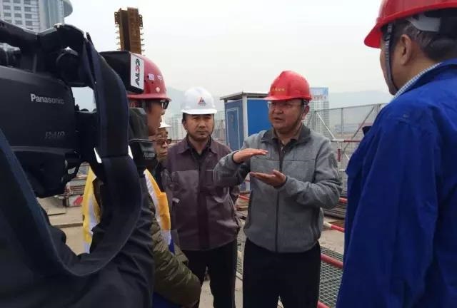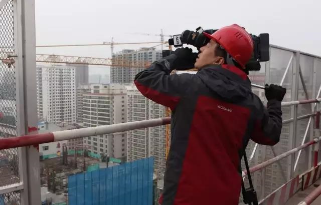CCTV欄目組正在現場拍攝這項達到國際先進水平的超高層頂模工藝“全自動頂升模架鋁模系統”。